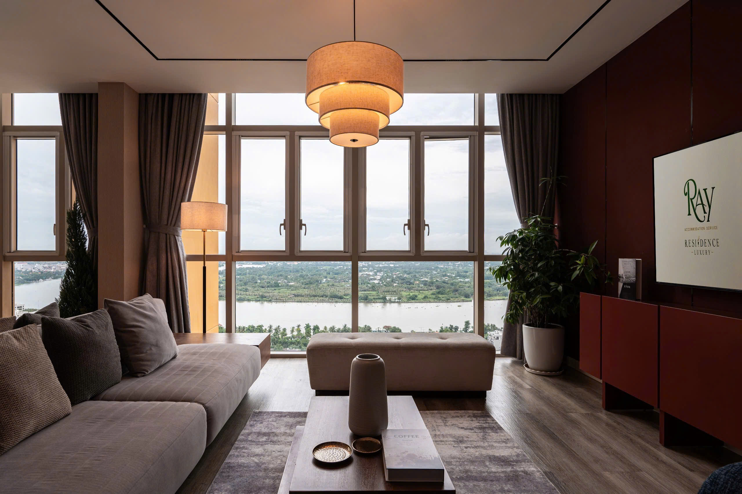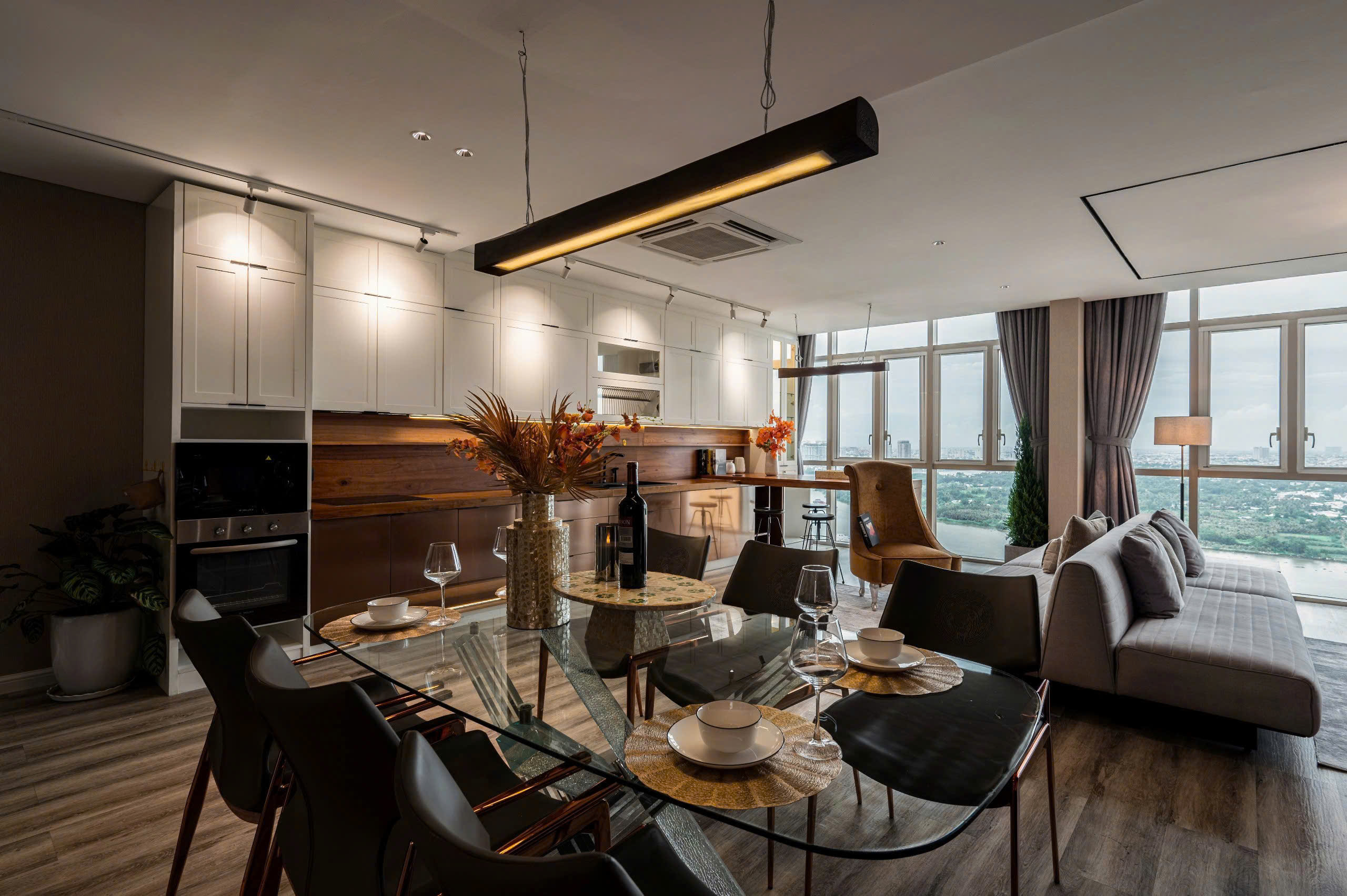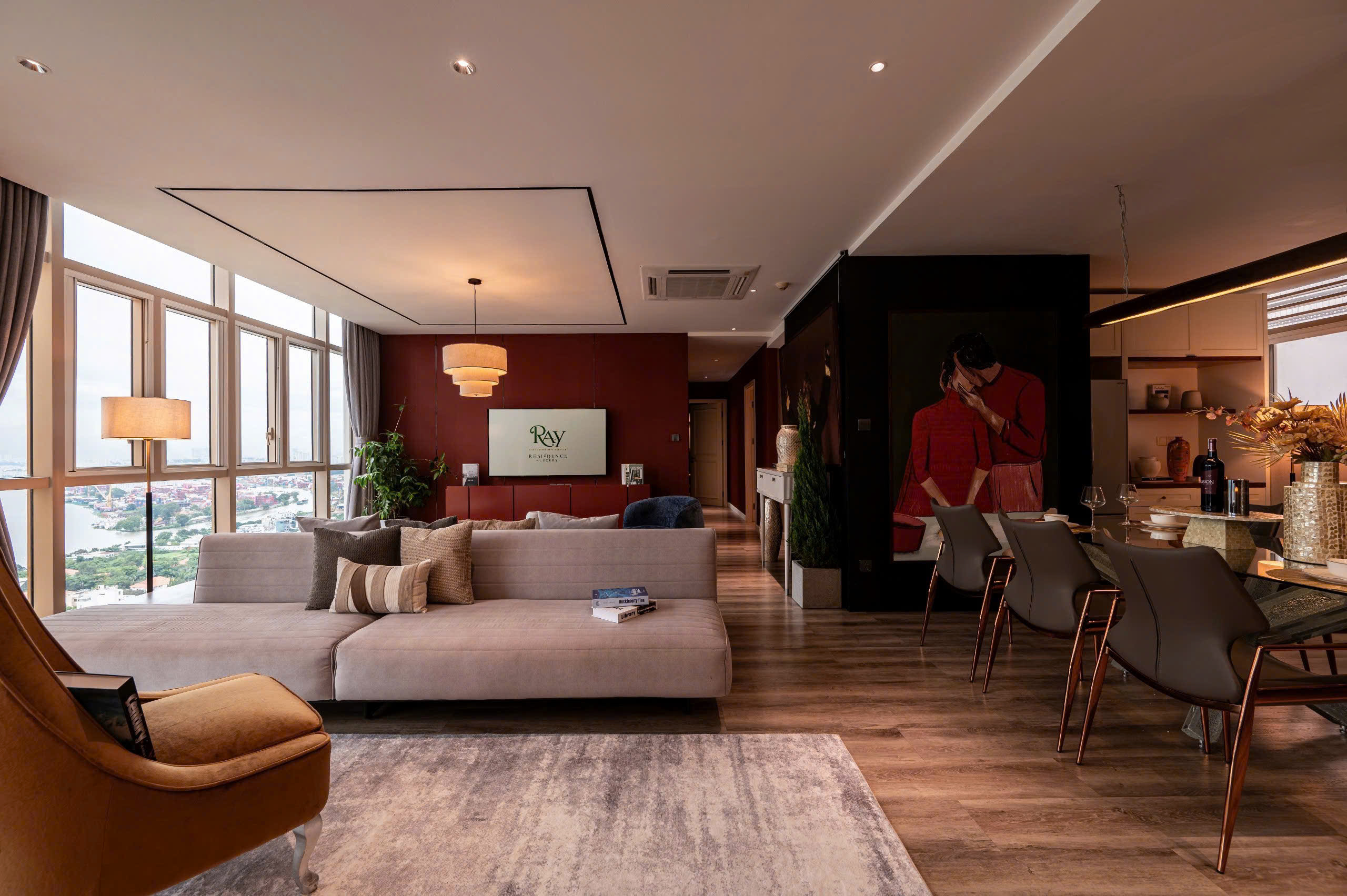 • Spacious living and dining area with panoramic city or river view