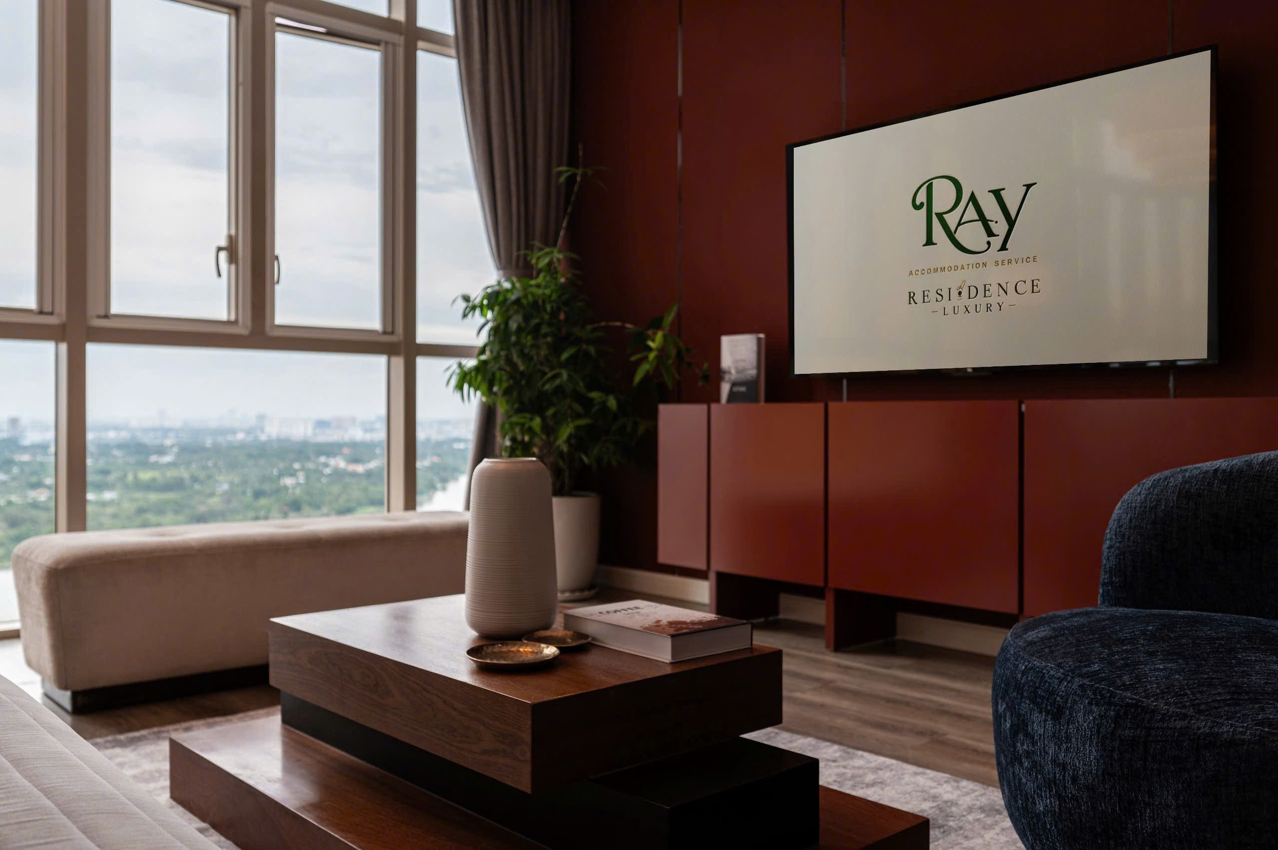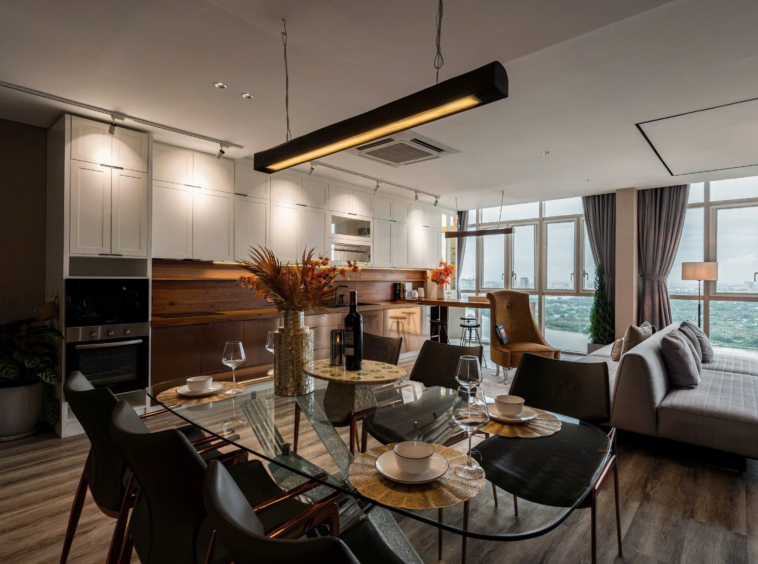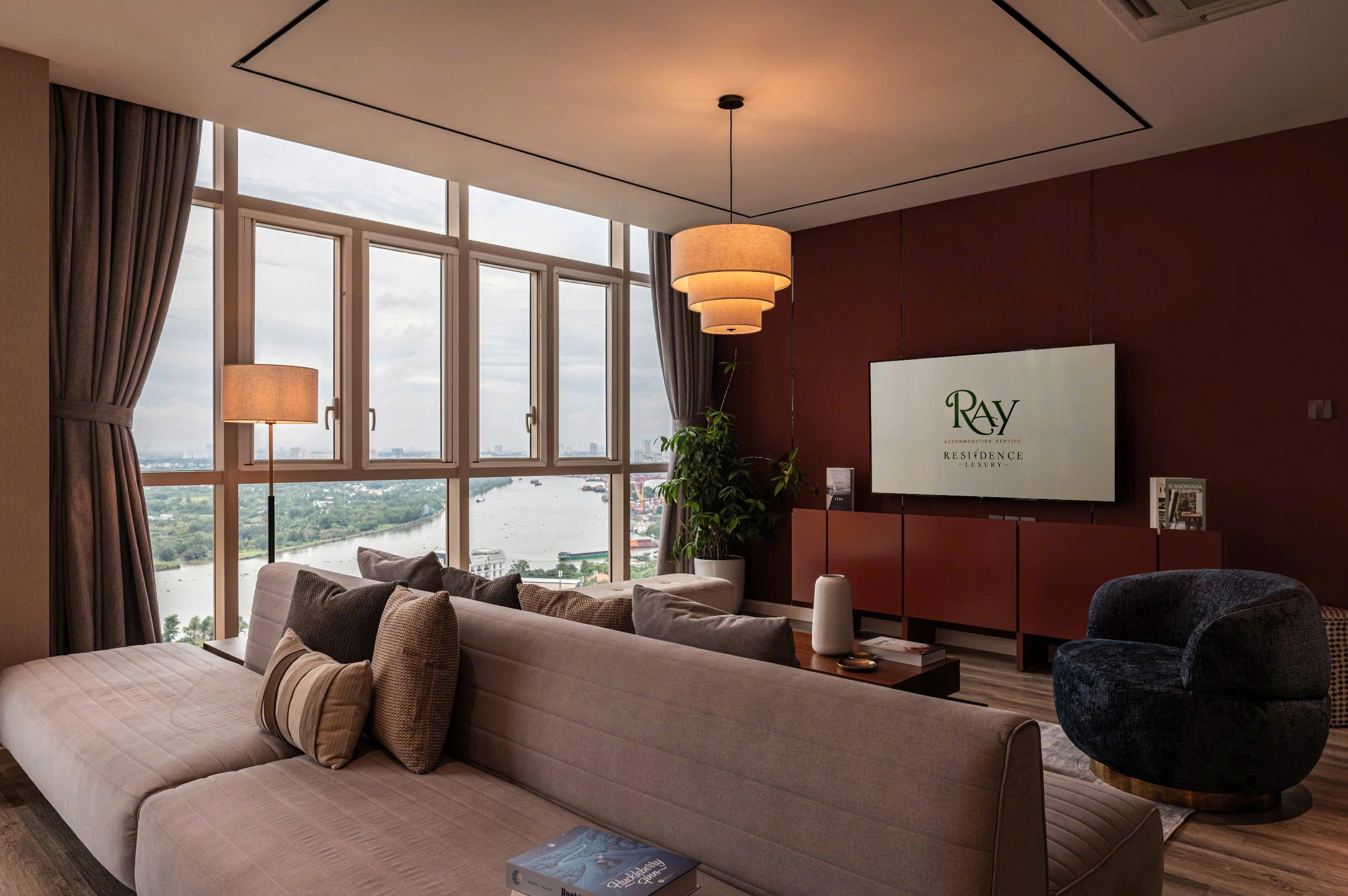 • Spacious living and dining area with panoramic city or river view